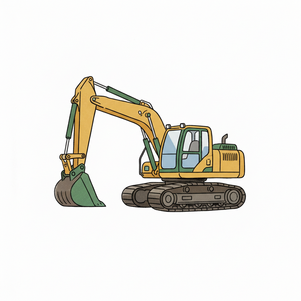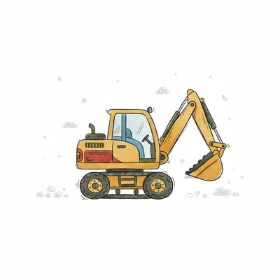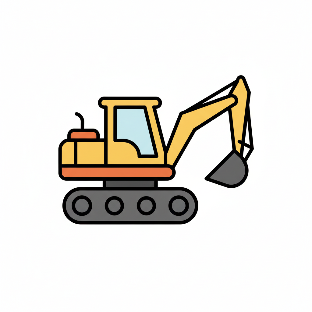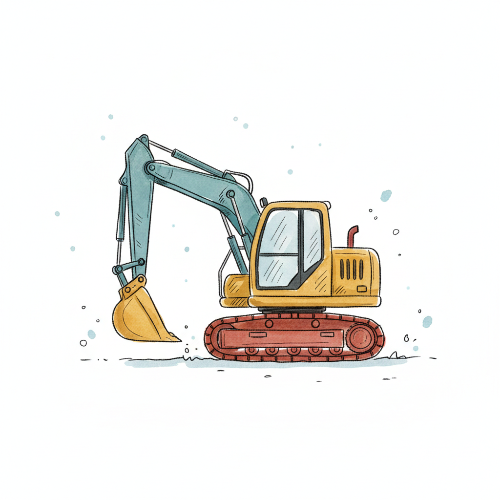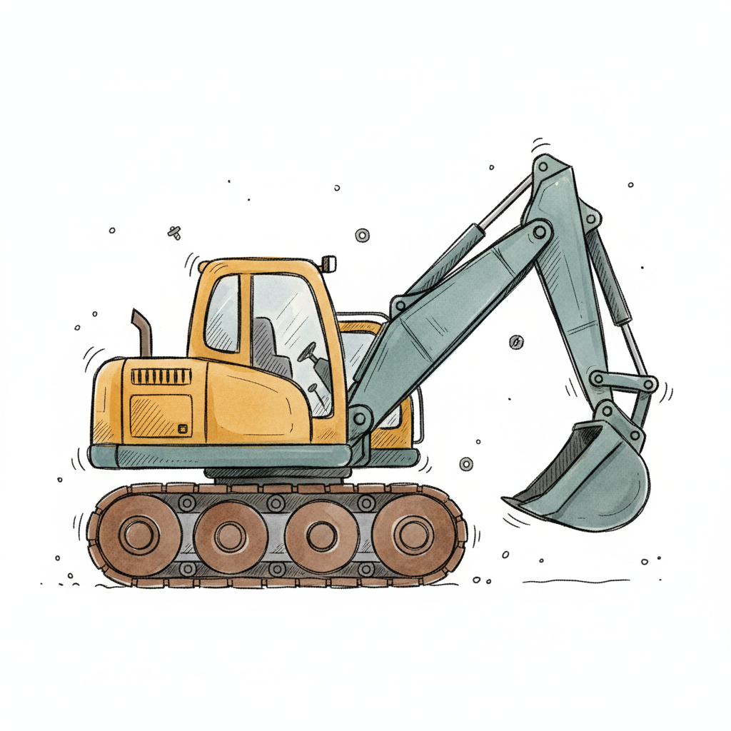Cartoon-Stil Illustration eines gelben Baggers mit tealfarbenem Arm und roten Ketten auf weißem Grund.