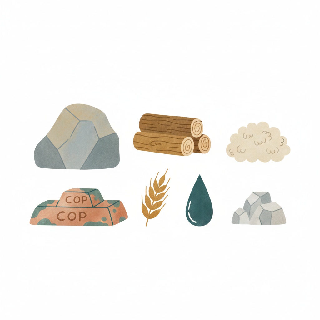 Illustration von Rohstoffen wie Steinen, Holz, Baumwolle, Kupfer, Weizen und Wasser.