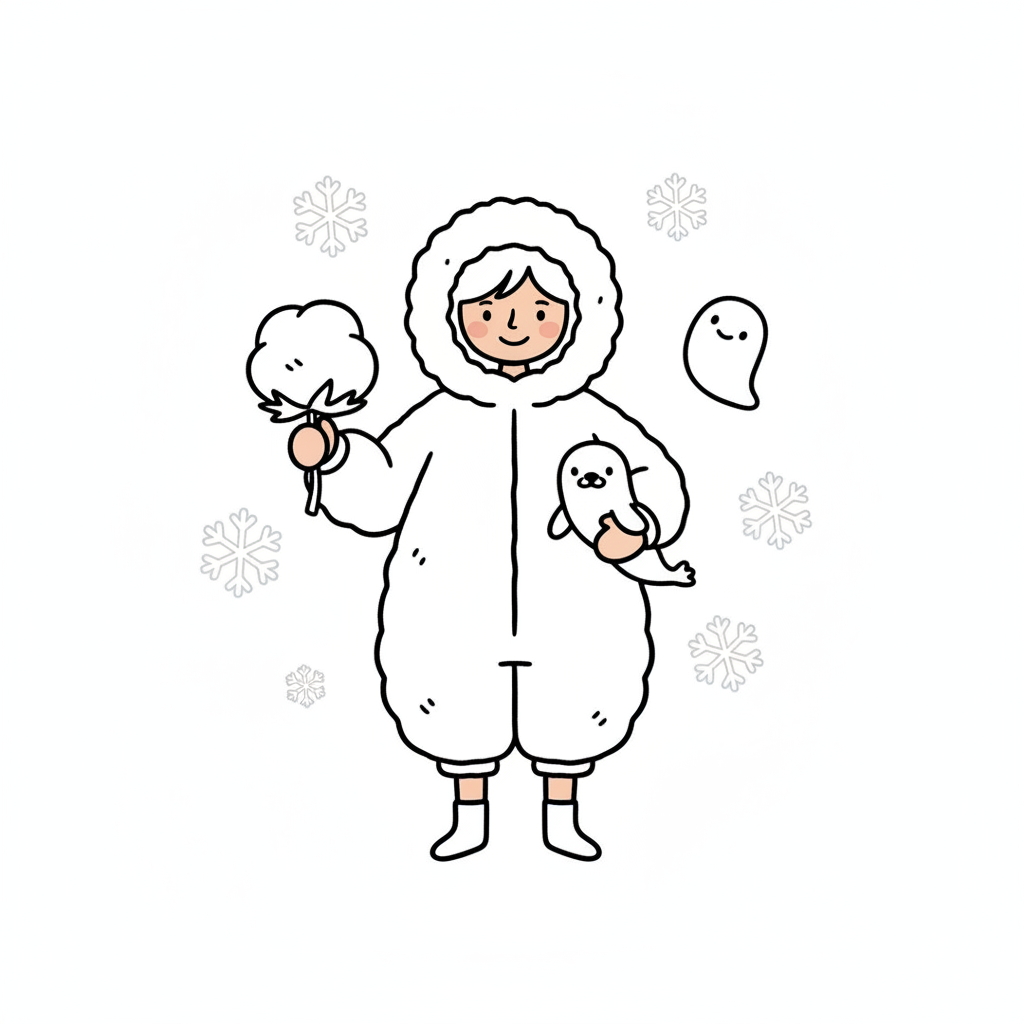 Niedliche Figur im Winteranzug hält Baumwolle und Robbe, umgeben von Schneeflocken und Geist.