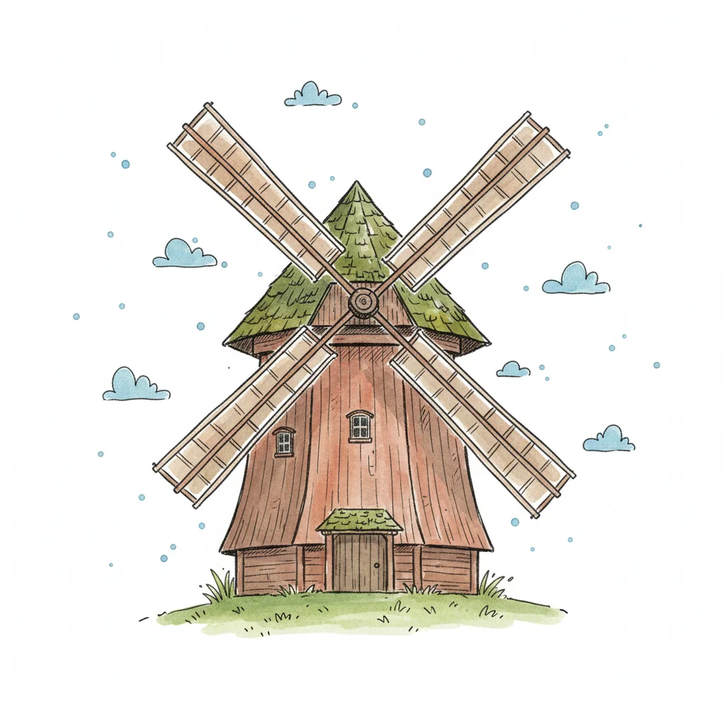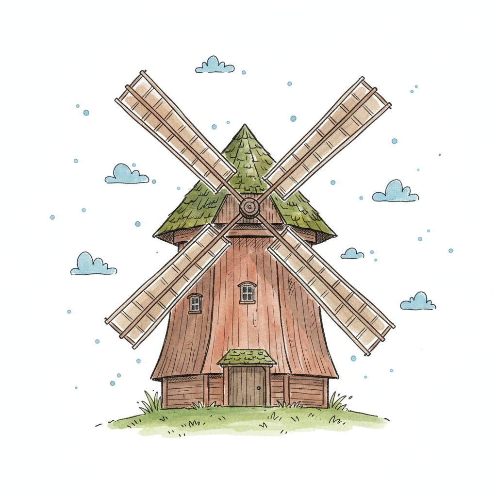 Niedliche Aquarell-Illustration einer Holzmühle mit grünem Dach auf einem Hügel unter Wolken.