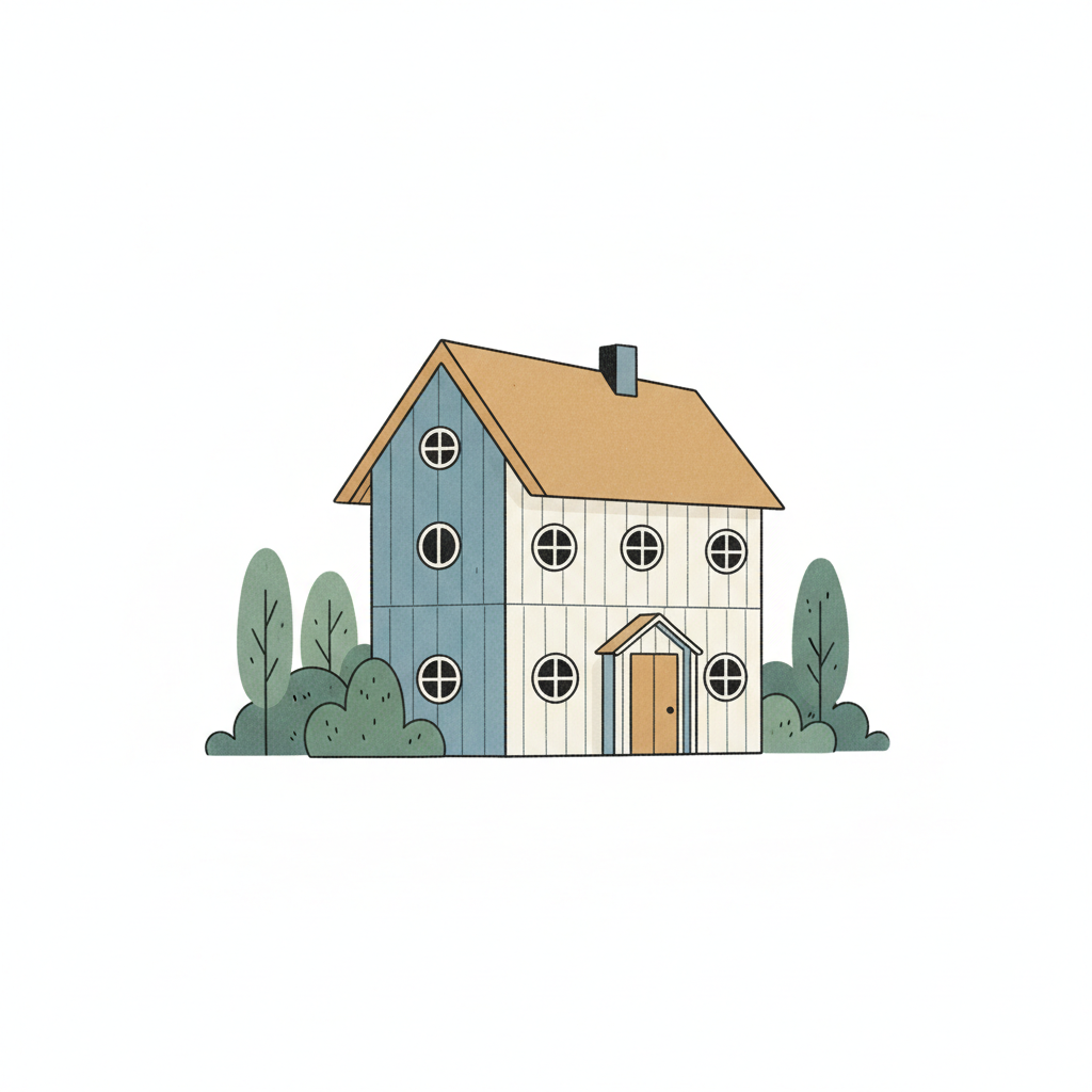Niedliche Illustration eines Hauses mit runden Fenstern, umgeben von Bäumen und Büschen.