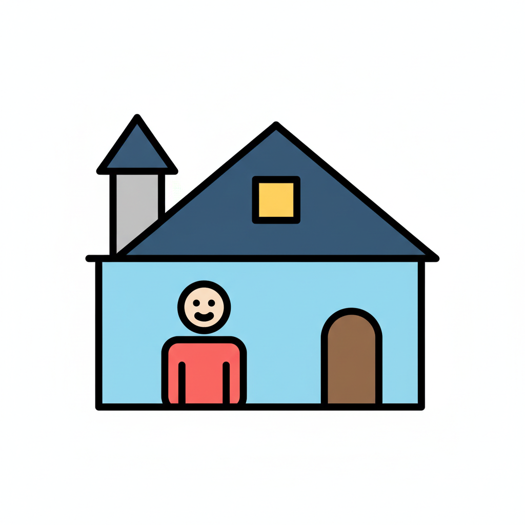Buntes Icon eines Hauses mit Schornstein, Dachfenster und einer lächelnden Person darin.
