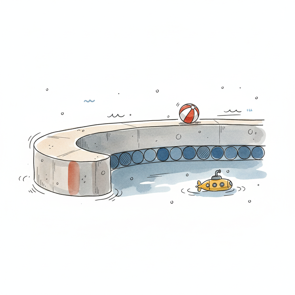 Ein gelbes U-Boot schwimmt in einem Becken neben einem Betonsteg mit einem Ball.