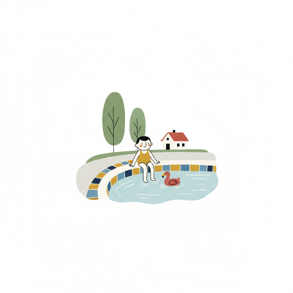 Stilisierte Person sitzt am Poolrand, die Beine im Wasser. Ein Ball schwimmt im Becken.
