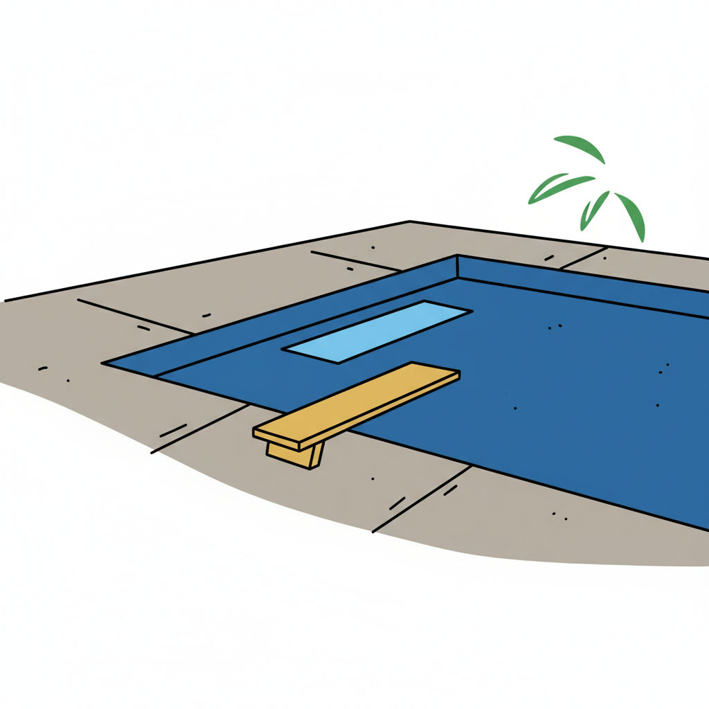 Cartoon-Illustration eines blauen Schwimmbeckens mit Sprungbrett und gepflastertem Rand.