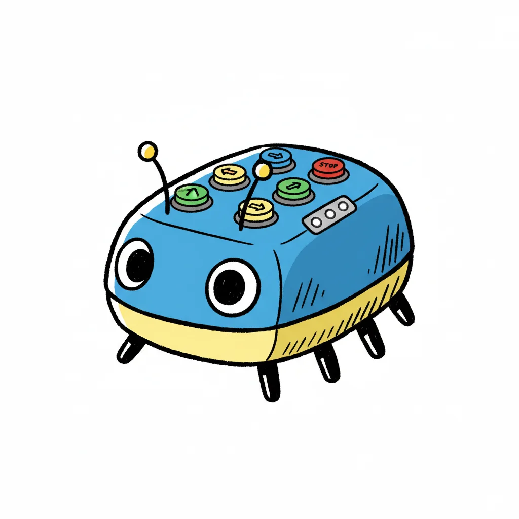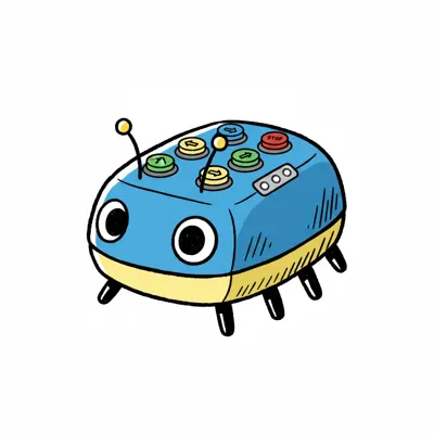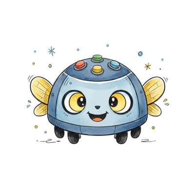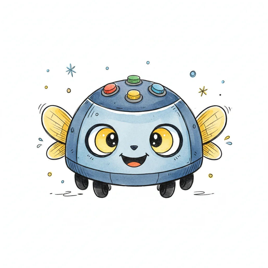 Ein niedlicher, blauer Käferroboter mit großen Augen, Antennen und bunten Knöpfen auf dem Rücken.