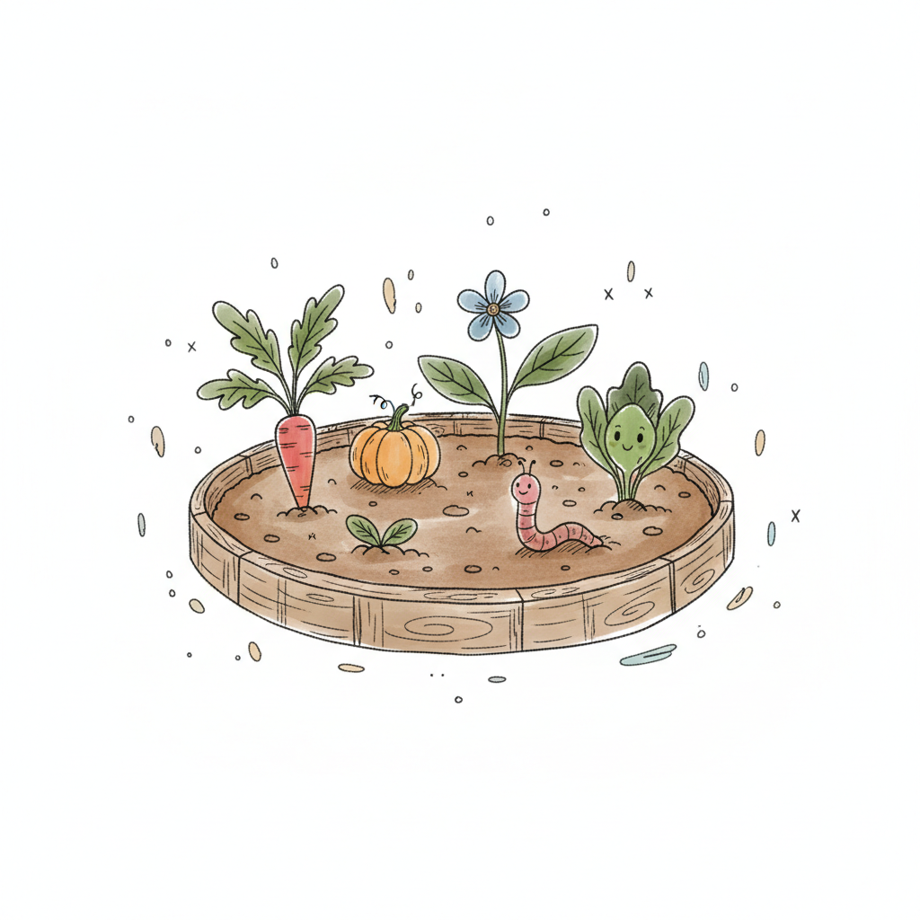 Niedliche Illustration eines Hochbeets mit Pflanzen, Schaufel und lächelnder Gießkanne.