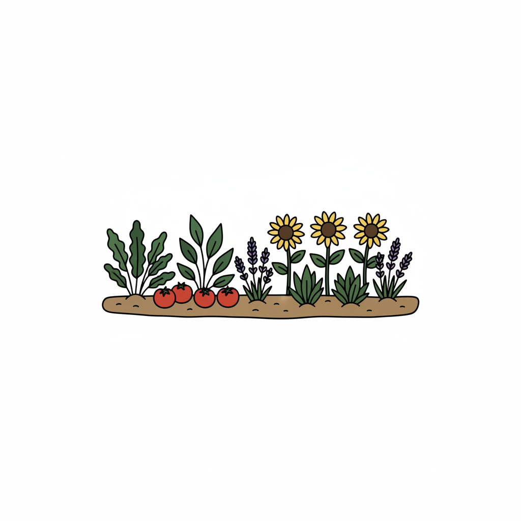 Illustration eines Gartenbeets mit Tomaten, Sonnenblumen, Lavendel und Grünpflanzen.