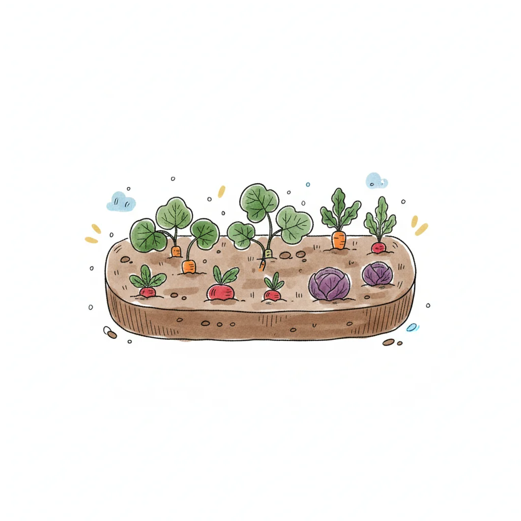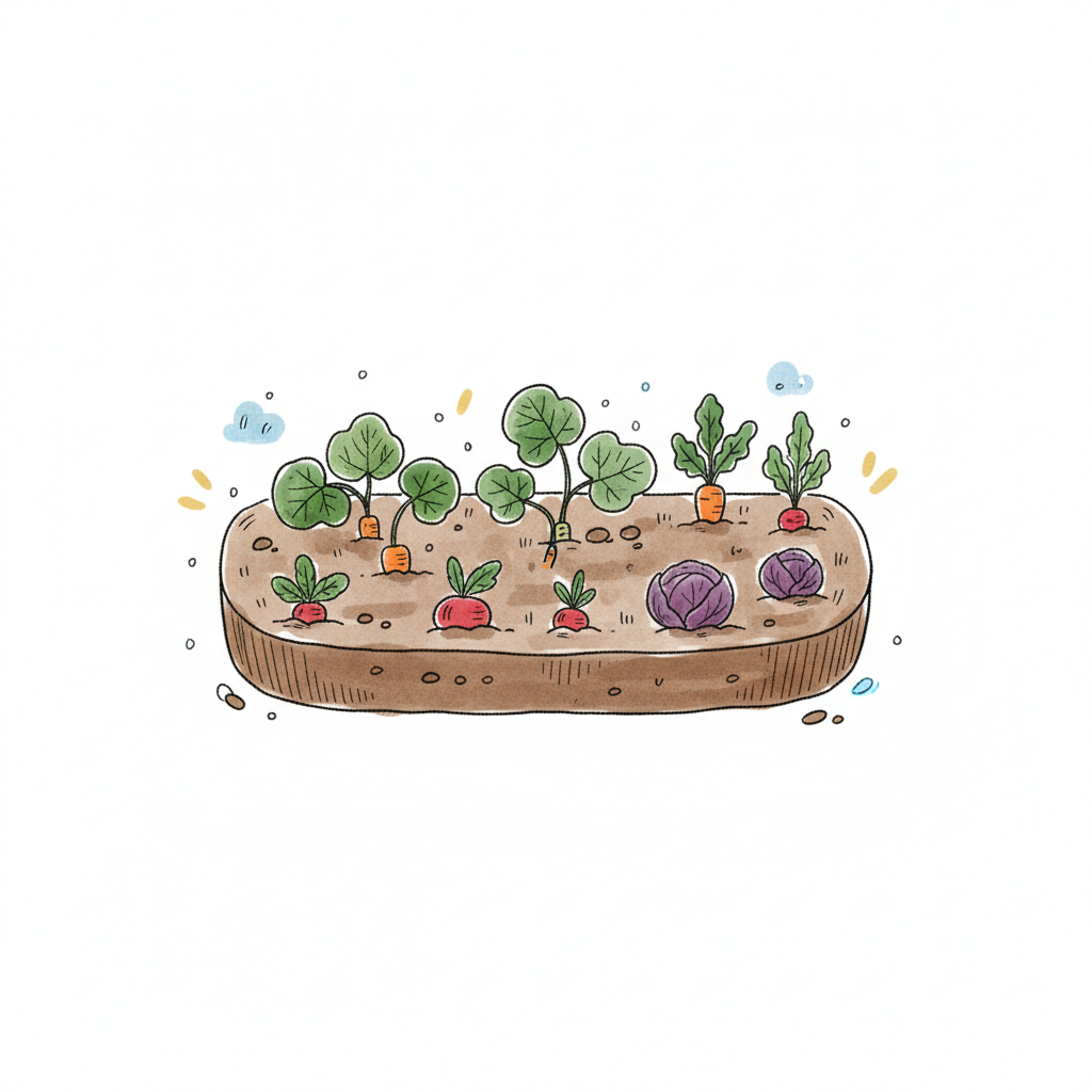 Buntes Gemüsebeet mit Karotten, Radieschen und Rotkohl in einem Cartoon-Stil.