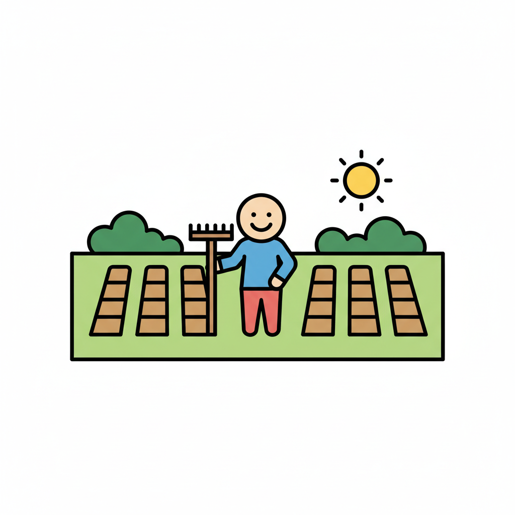 Ein lächelnder Gärtner mit Rechen steht auf einem Feld mit Beeten unter der Sonne.