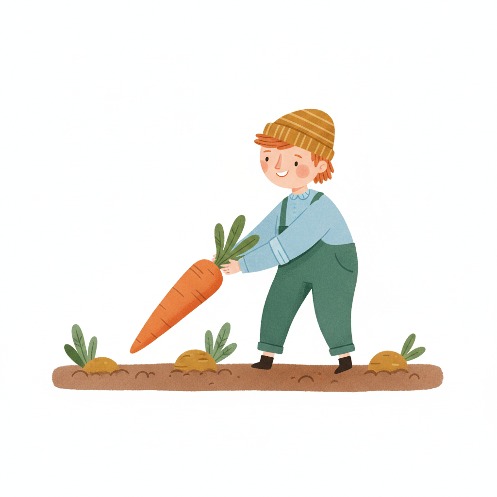 Ein fröhliches Kind in Latzhose erntet eine große Karotte aus dem Gartenbeet.