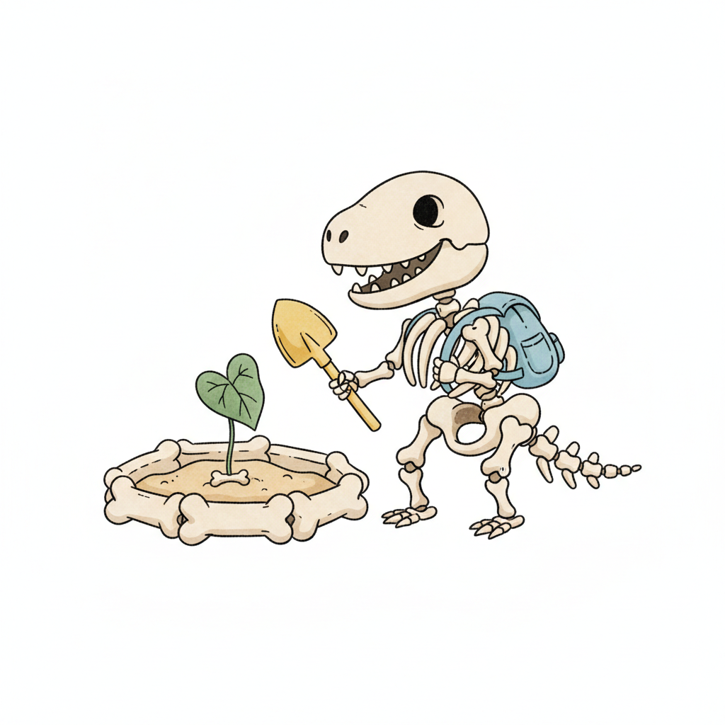 Ein niedliches Dinosaurierskelett mit Rucksack und Schaufel pflanzt eine kleine Pflanze in einem Knochenbeet.