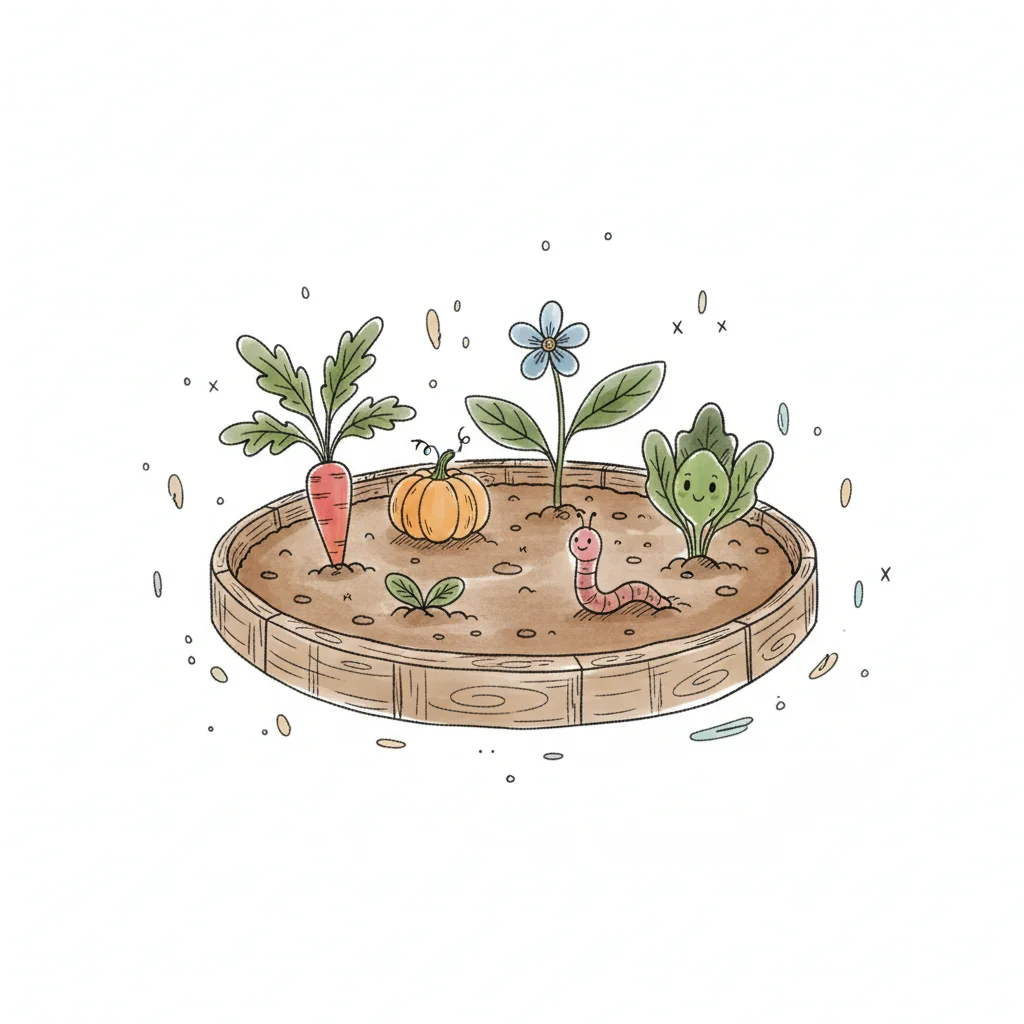 Niedliches Aquarellbild eines kleinen Gartens mit Gemüse, Blume und einem lächelnden Wurm.