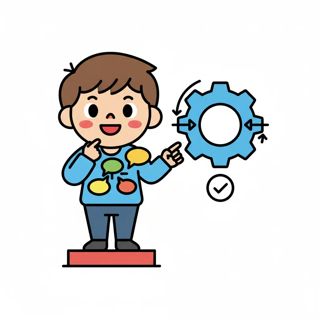 Junge mit Sprechblasen zeigt auf Zahnrad mit Prozess- und Optimierungssymbolen und Haken.