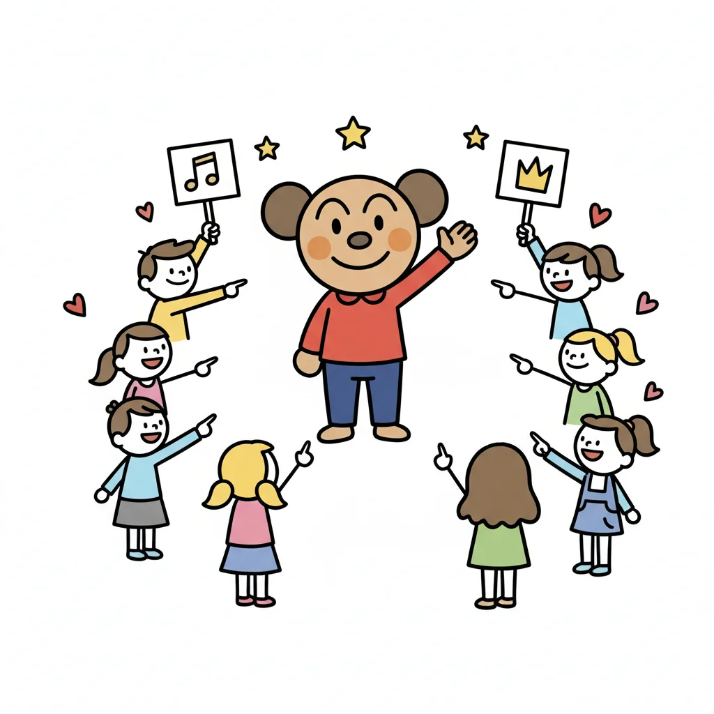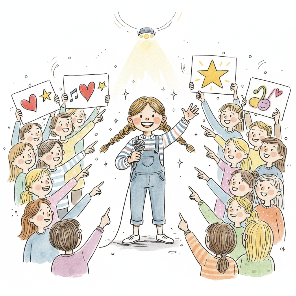 Fröhliches Mädchen mit Mikrofon im Rampenlicht, umgeben von jubelnden Kindern mit Schildern.