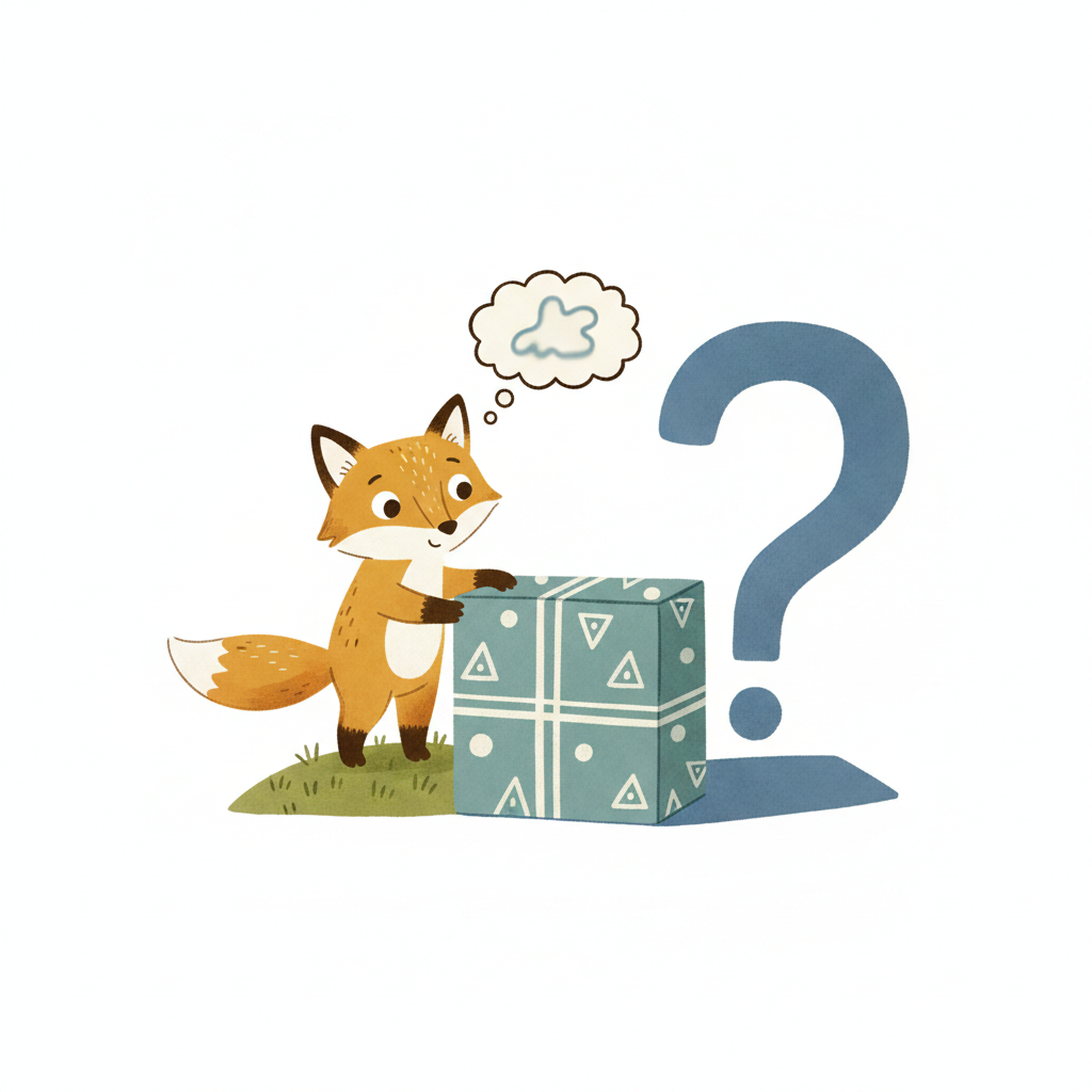 Ein neugieriger Fuchs steht vor einem Geschenkpaket und einem großen Fragezeichen, er rätselt.