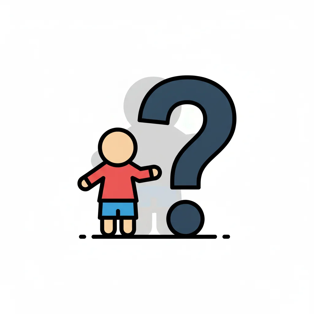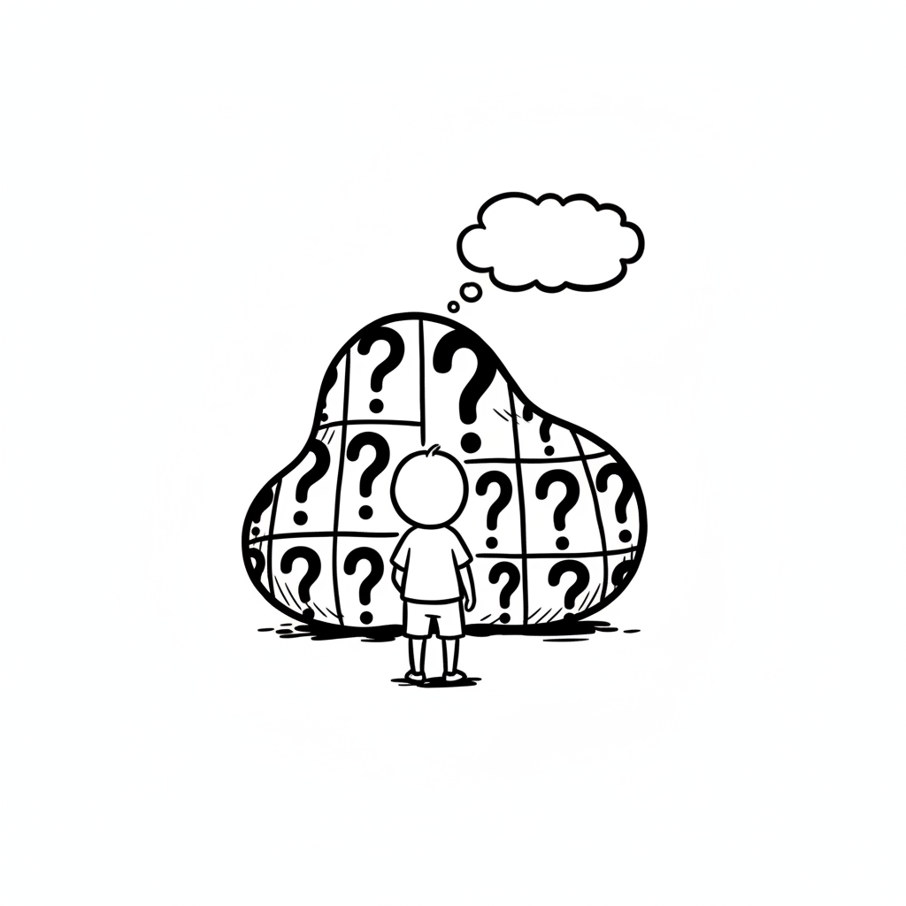 Cartoon-Figur steht fragend neben einem großen Fragezeichen.