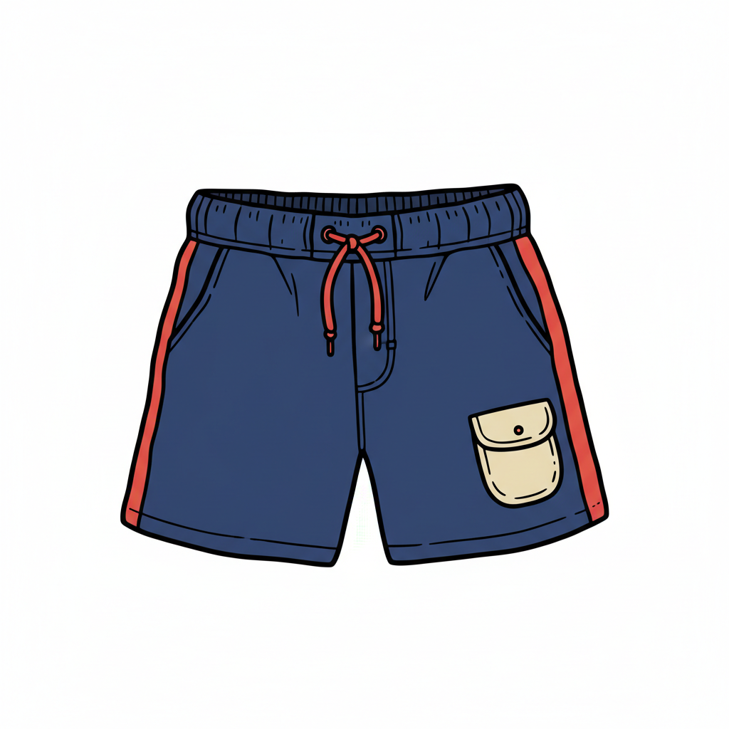 Blaue Schwimmshorts mit rotem Streifen und einer Seitentasche.