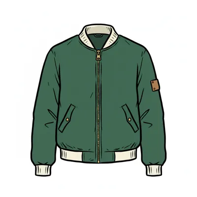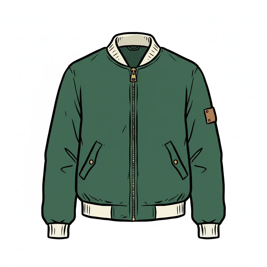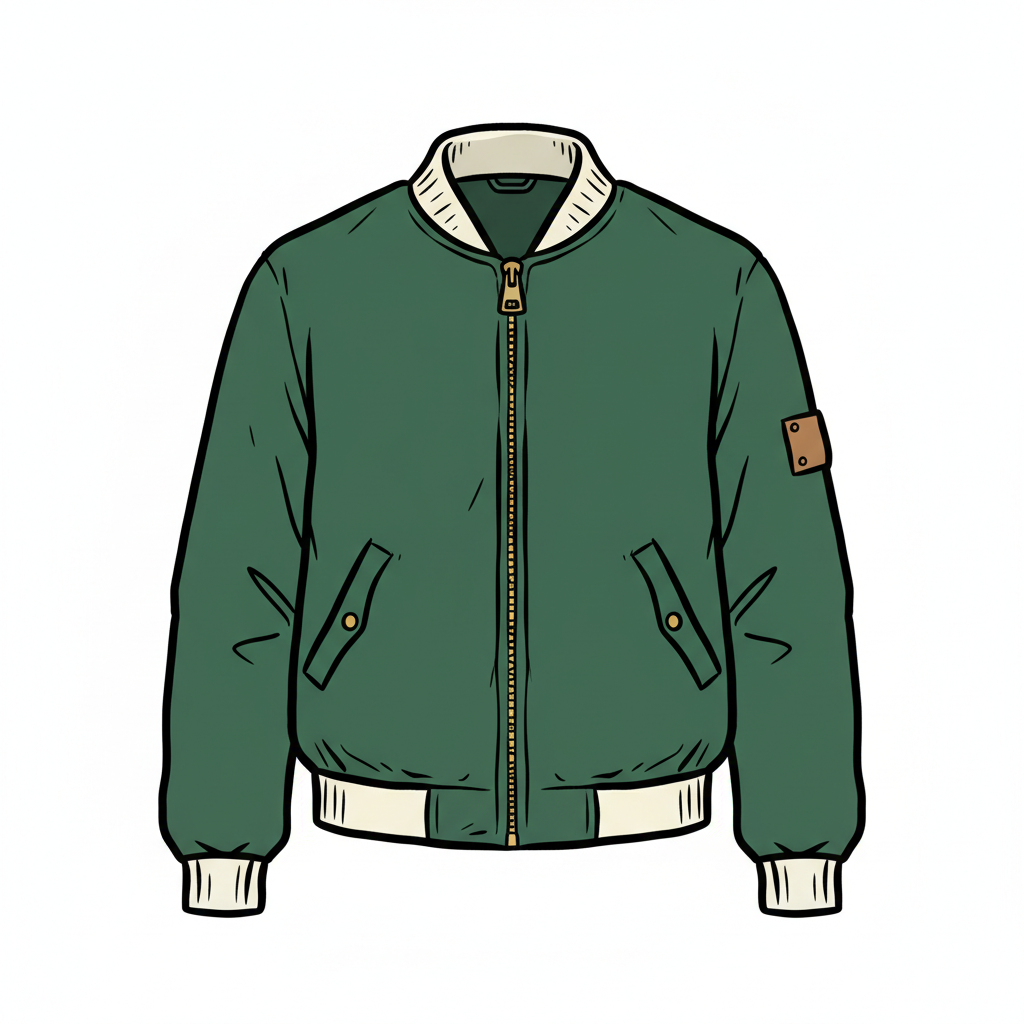 Grüne Bomberjacke mit Reißverschluss und weißen Bündchen.
