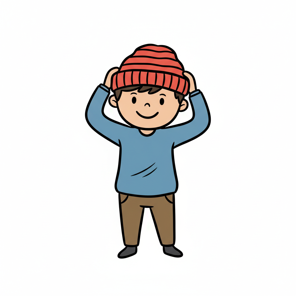 Handgezeichnete Kinderbuchillustration im modernen skandinavisch-nordischen Stil. Minimalistische, freundliche Figur mit einfachen Formen und leicht unregelmäßigen, handgezeichneten Linien. Ruhige, gedeckte Farbpalette, viel freie Fläche, reduzierte Details, sanfte Papier- oder Aquarellstruktur. Warme, ruhige, leicht humorvolle Stimmung, flächige Komposition ohne starke Perspektive, moderner nordischer Illustrationsstil, charmant und zeitlos.