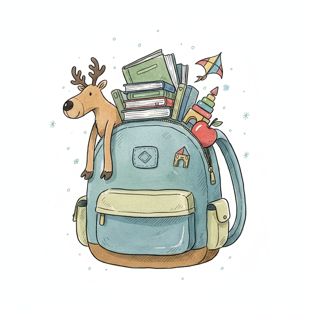 Ein überfüllter blauer Rucksack mit Büchern, Spielzeug, Apfel und einem Rentier. Kindheit, Schule.