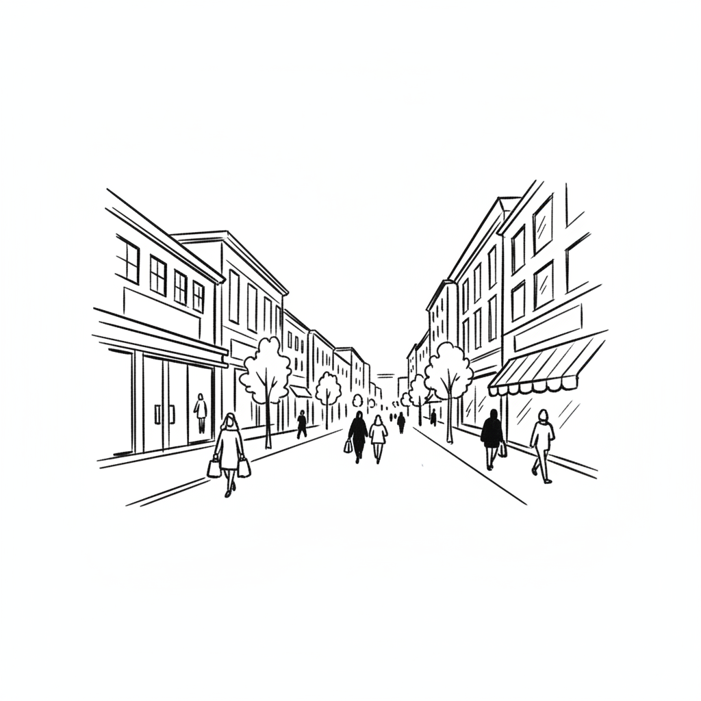 Schwarz-weiß-Skizze einer belebten Einkaufsstraße mit Gebäuden, Bäumen und Fußgängern.