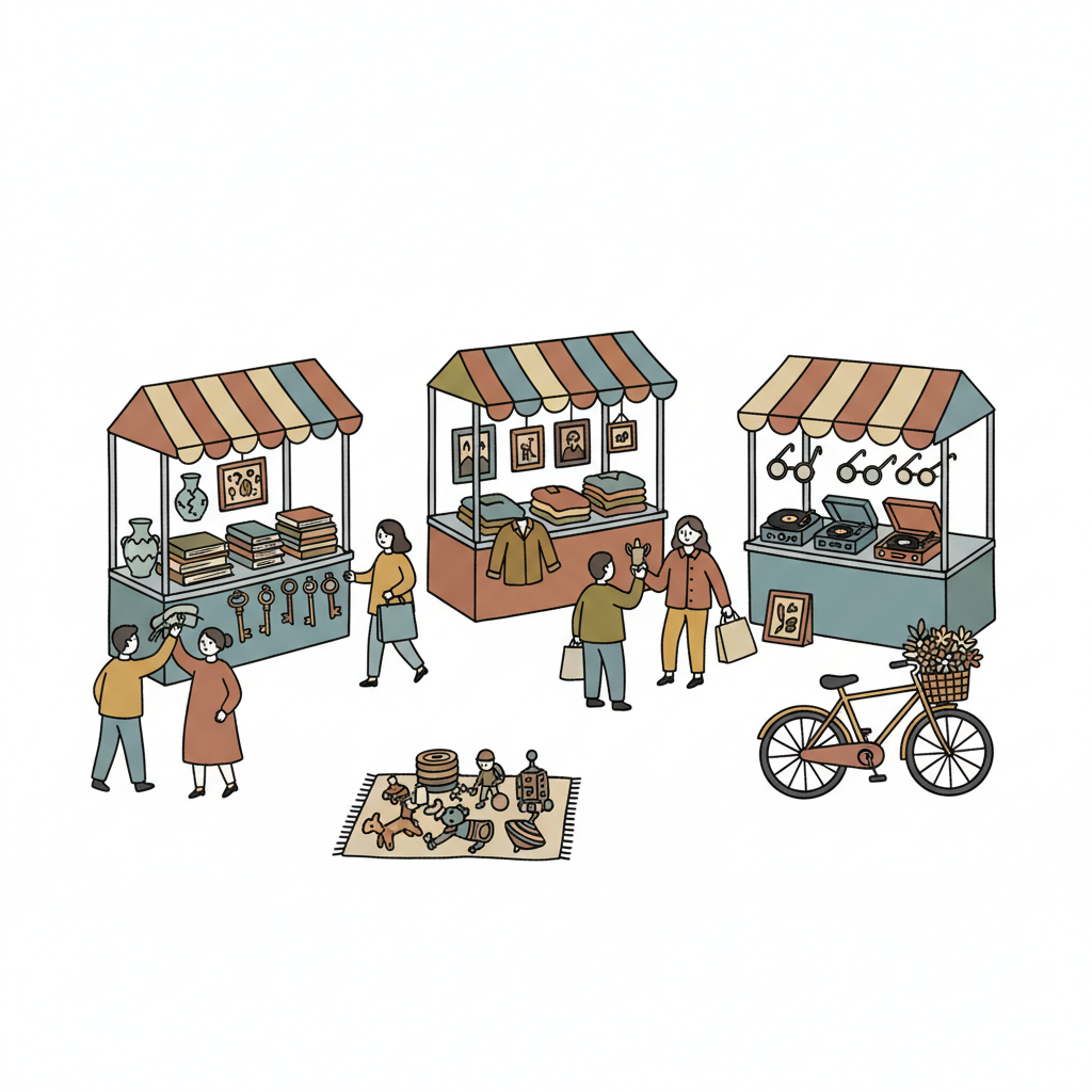 Illustration eines belebten Flohmarktes mit Ständen, Menschen, Kleidung, Büchern und Schallplatten.