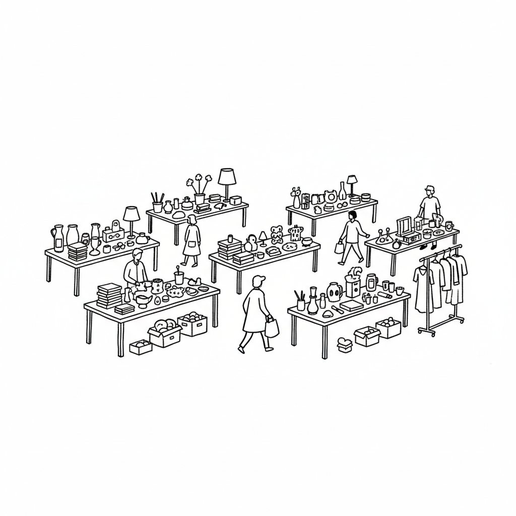 Schwarz-weiß-Illustration eines belebten Flohmarktes mit Tischen voller Waren und Menschen.