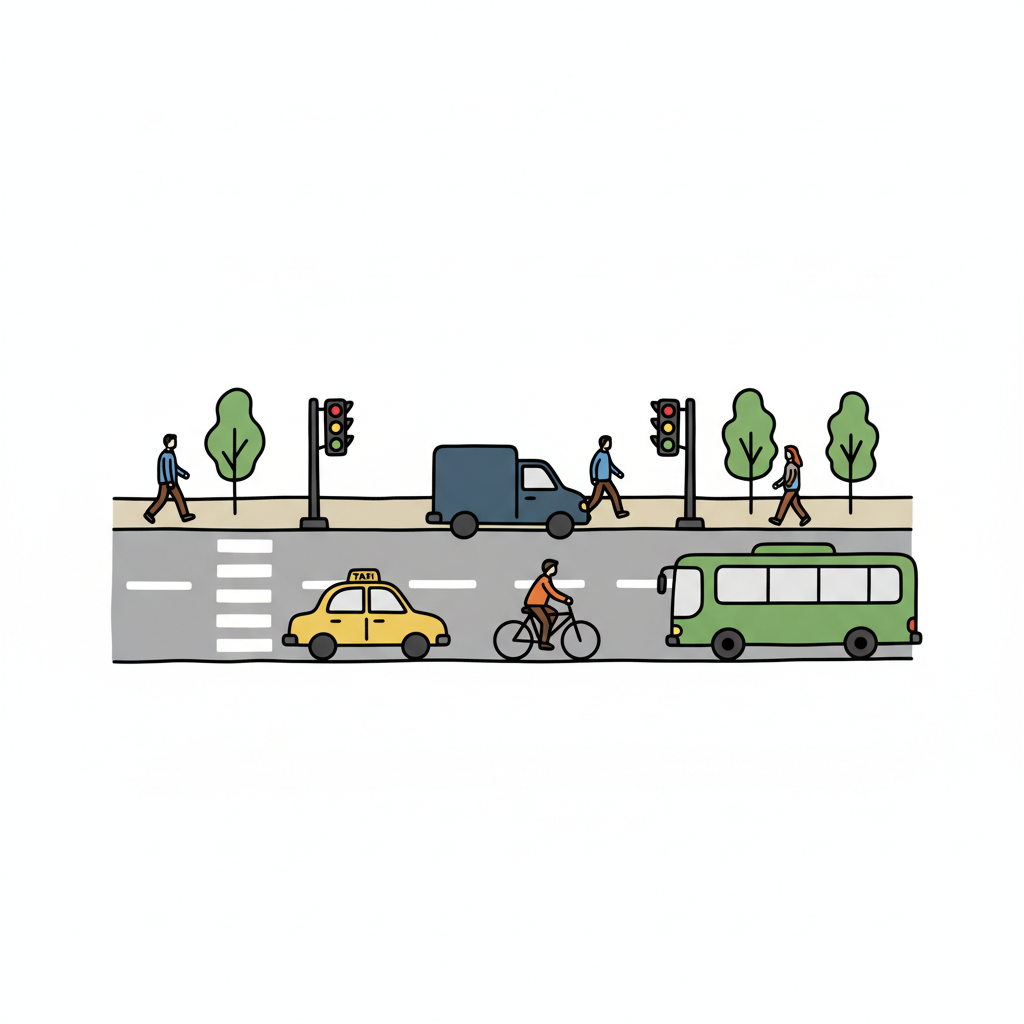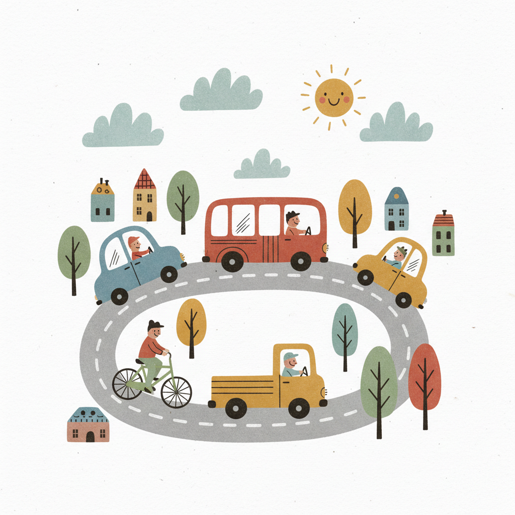 Bunte Illustration einer belebten Straße mit Fahrzeugen, Radfahrer, Häusern und lächelnder Sonne.