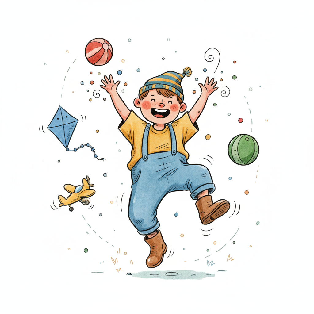 Ein fröhliches Kind springt vor Freude, umgeben von bunten Spielsachen wie Bällen, Drachen und Flugzeug.