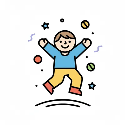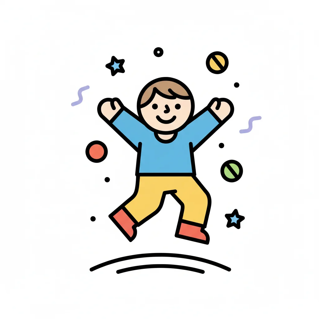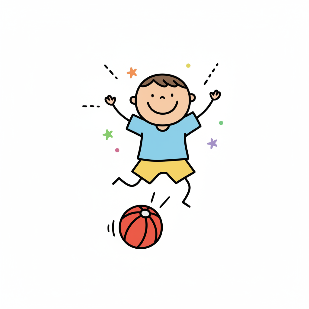 Ein fröhliches Strichmännchen-Kind springt über einen Ball, umgeben von bunten Sternen.