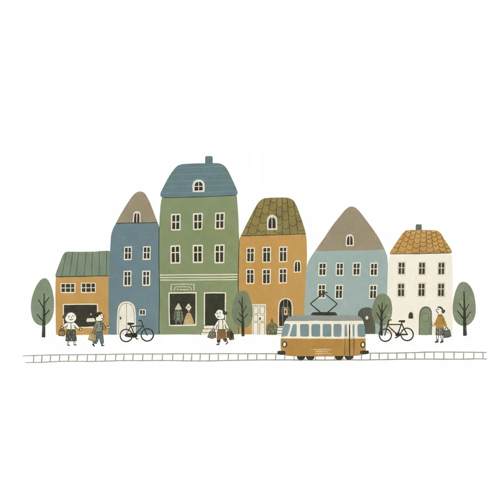 Niedliche Illustration einer belebten Stadtstraße mit bunten Häusern, Menschen, Fahrrädern und einer Straßenbahn.