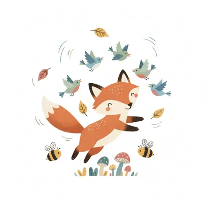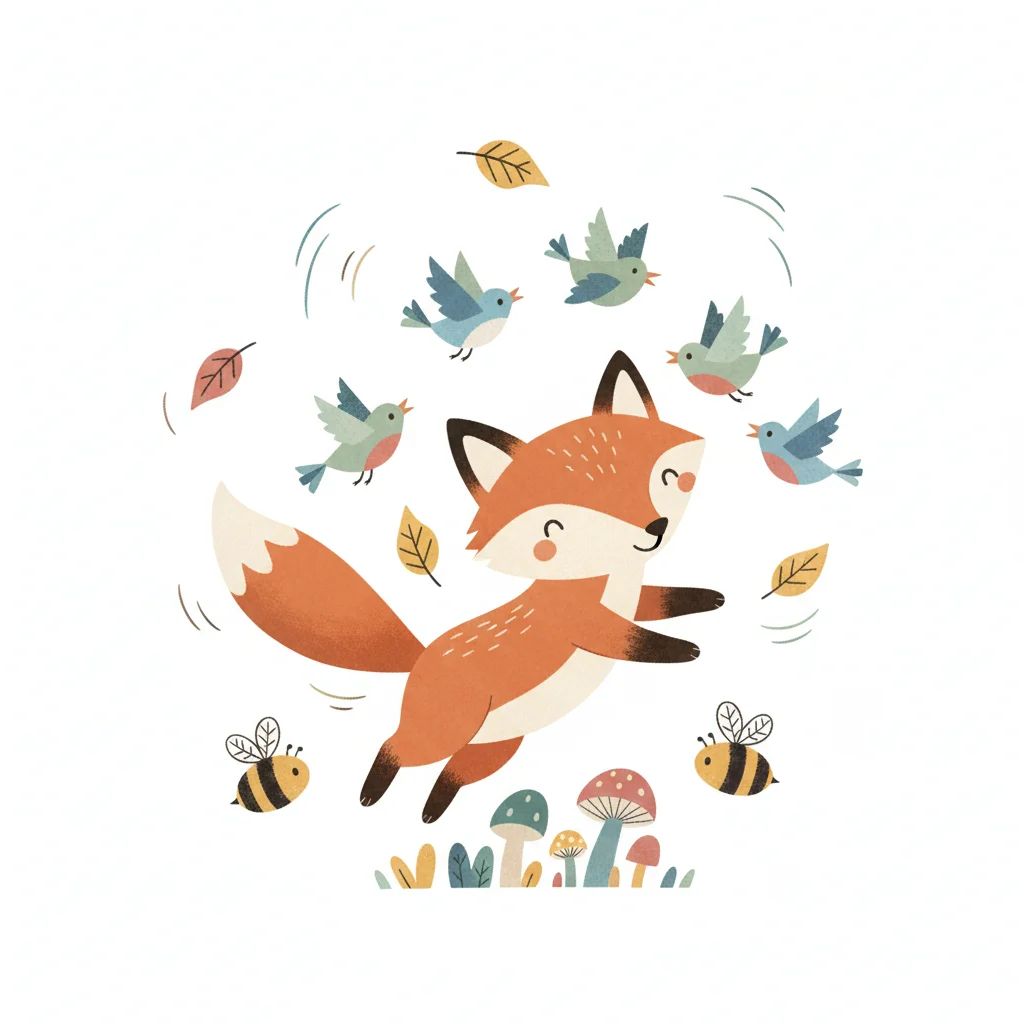 Ein süßer Fuchs springt fröhlich inmitten von Vögeln, Bienen und Herbstblättern.