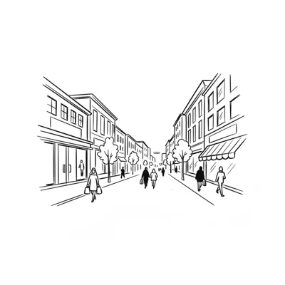 Schwarz-weiße Strichzeichnung einer belebten Stadtstraße mit Cafés, Gebäuden und Menschen.