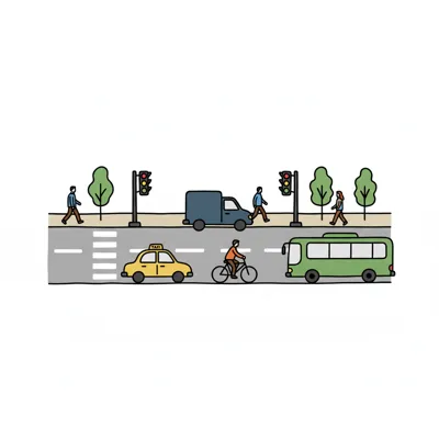 Eine belebte Straßenszene mit Fußgängern, Fahrzeugen (Taxi, Bus, Van, Fahrrad) und Ampeln.