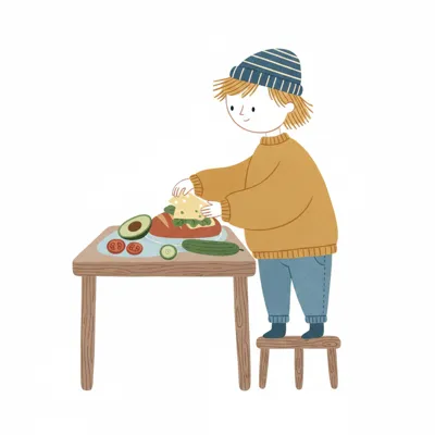 Niedliche Illustration: Kind macht Sandwich mit Gemüse und Käse, steht auf Hocker.