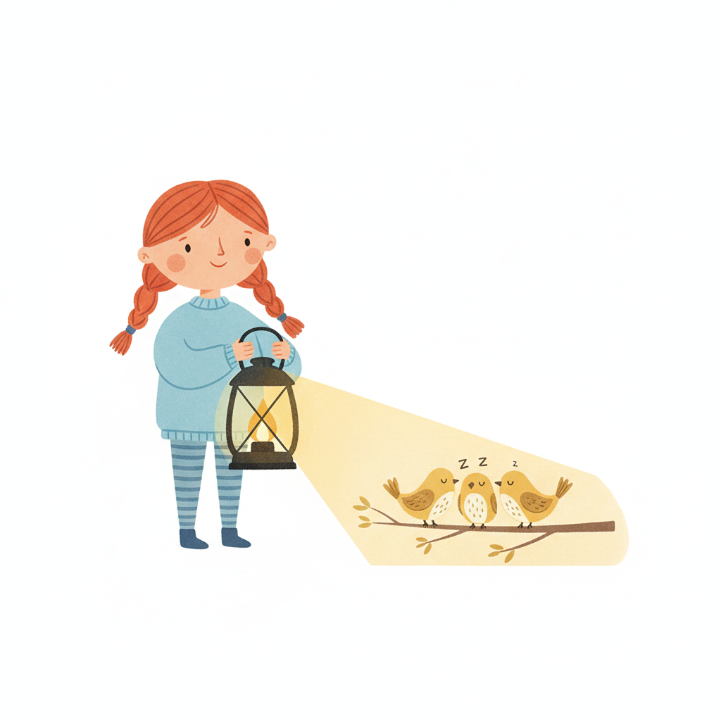 Mädchen mit Laterne leuchtet auf schlafende Vögel auf einem Ast.