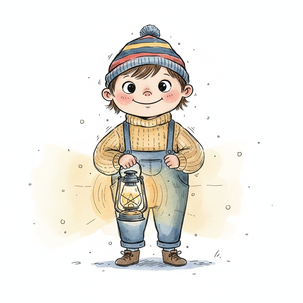 Niedliches Cartoon-Kind in Winterkleidung hält eine leuchtende Laterne und lächelt.