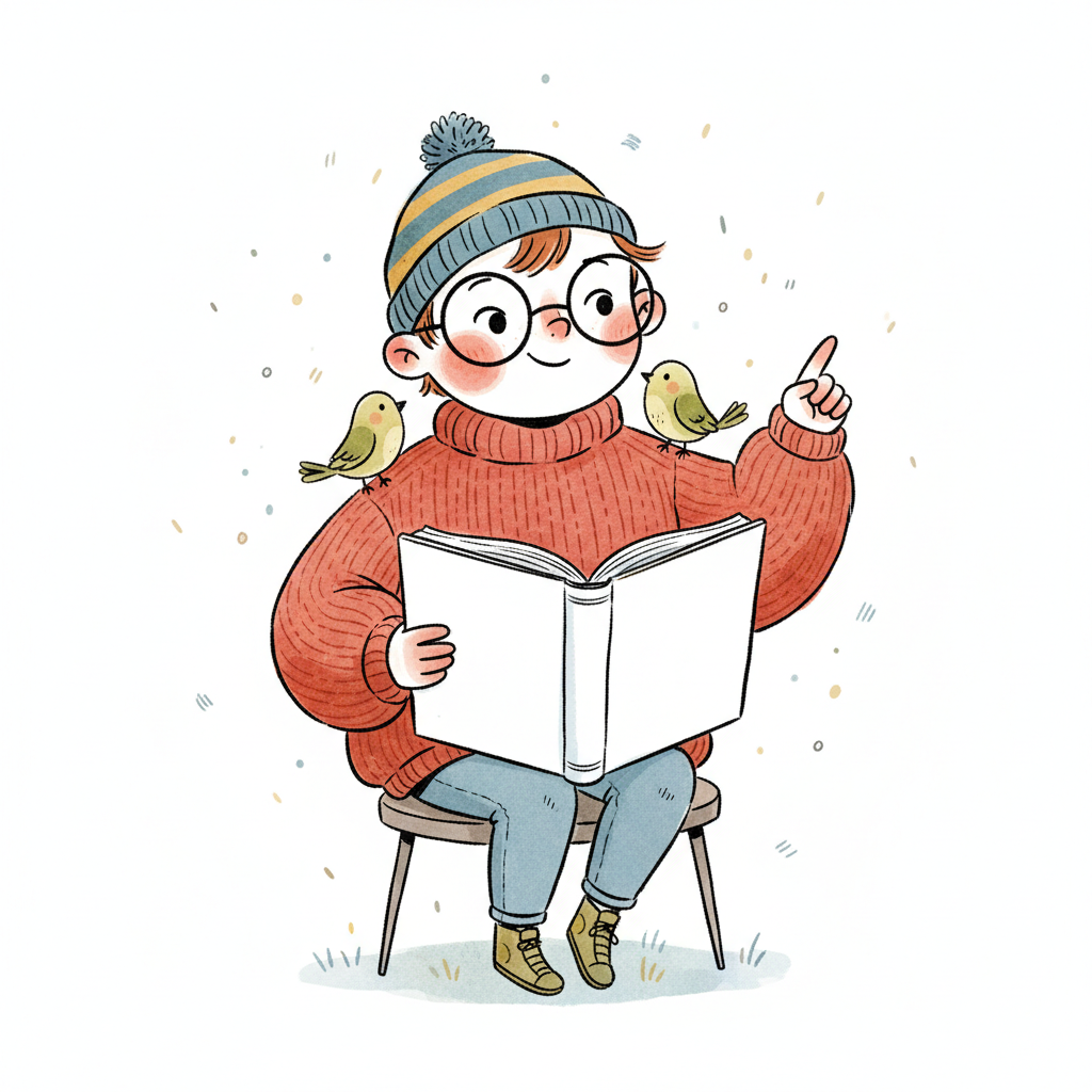 Niedlicher Junge mit Brille und Mütze liest ein Buch, zwei Vögel sitzen auf seinen Schultern.