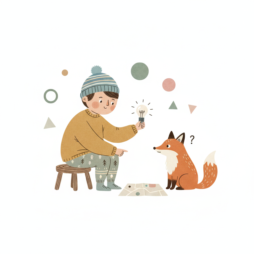 Illustration: Junge mit Idee zeigt Fuchs, der verwirrt ist, eine Karte.