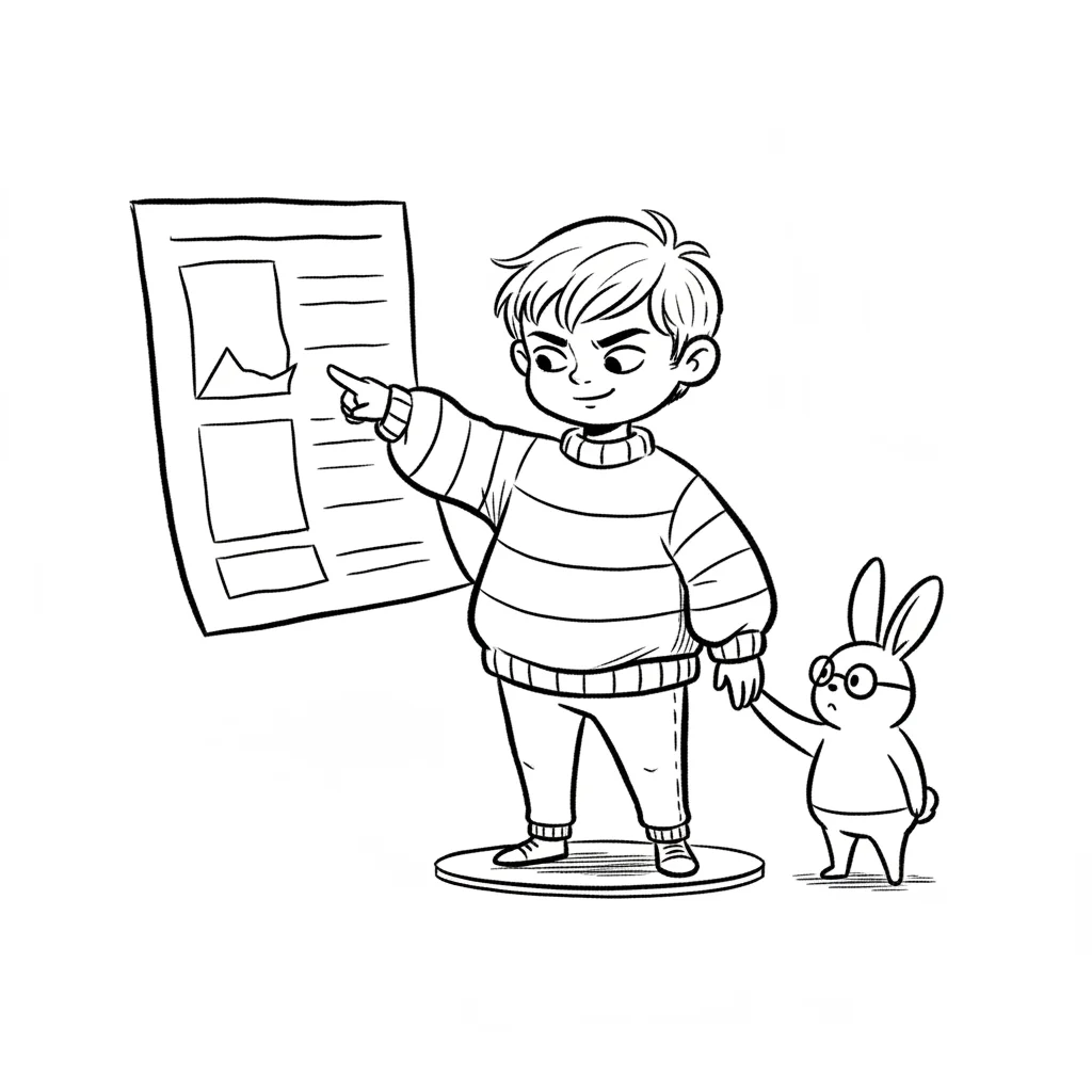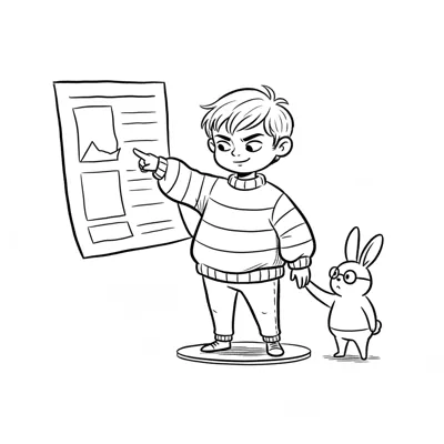 Junge zeigt auf Diagramm, Hase mit Brille hält seine Hand. Schwarz-weiß-Cartoon.