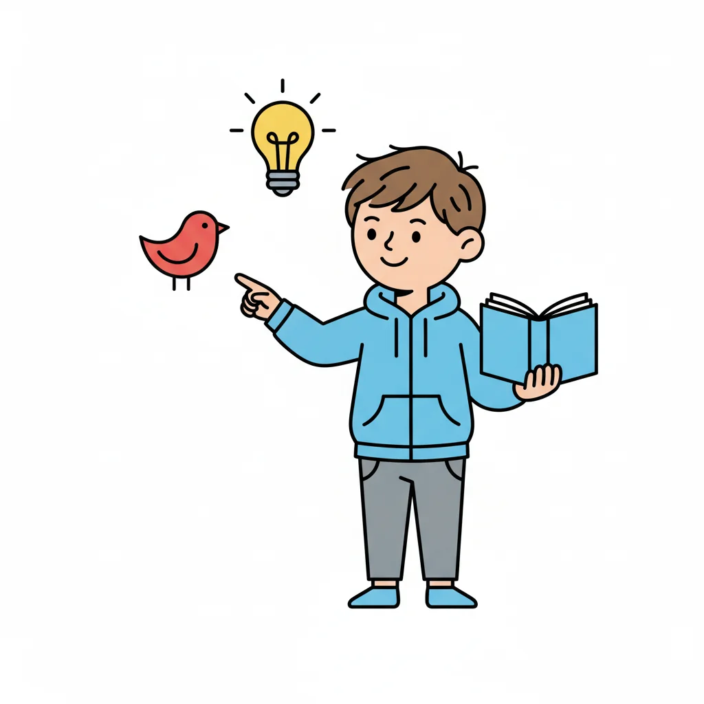 Junge mit Buch zeigt auf Vogel und Glühbirne, symbolisiert Lernen, Natur und neue Ideen.