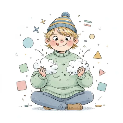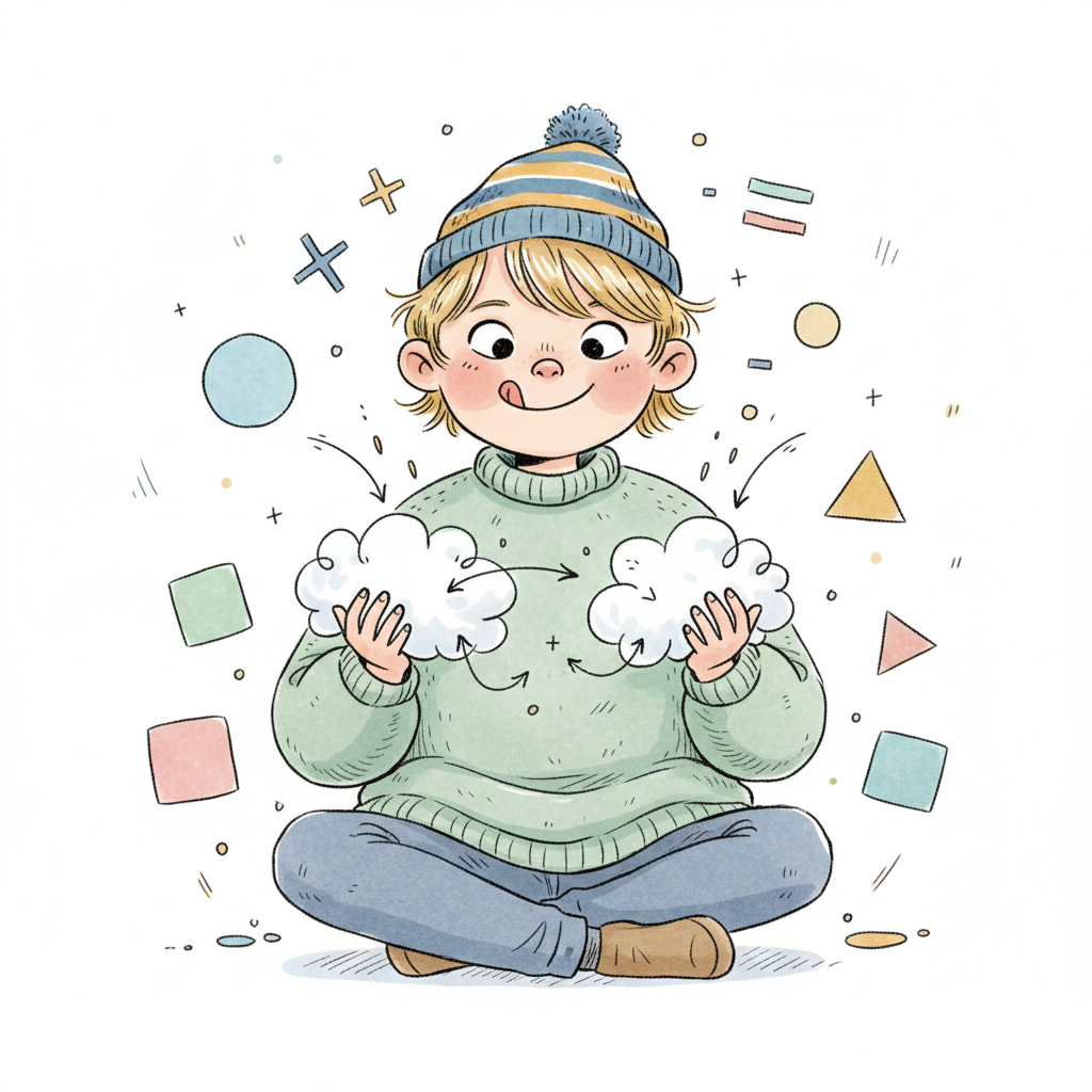 Junge mit Mütze hält Wolken, umgeben von Formen und Symbolen, die Kreativität andeuten.