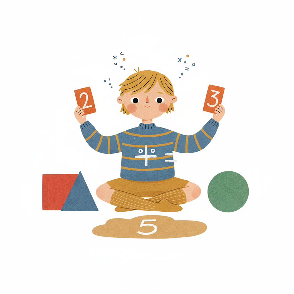 Kind lernt Mathematik mit Zahlenkarten (2, 3), geometrischen Formen und der Zahl 5.