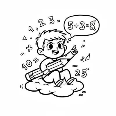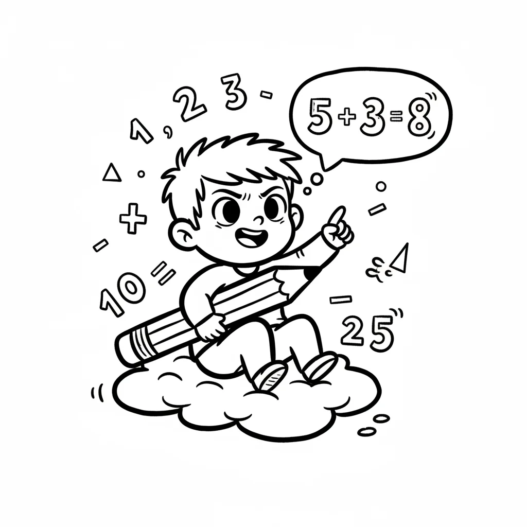 Ein Cartoon-Junge sitzt auf einer Wolke, hält einen Bleistift und ist von Mathe-Symbolen umgeben.