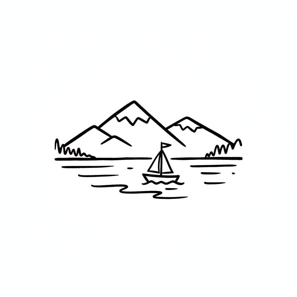 Minimalistische Strichzeichnung: Segelboot auf See vor einer Bergkette.