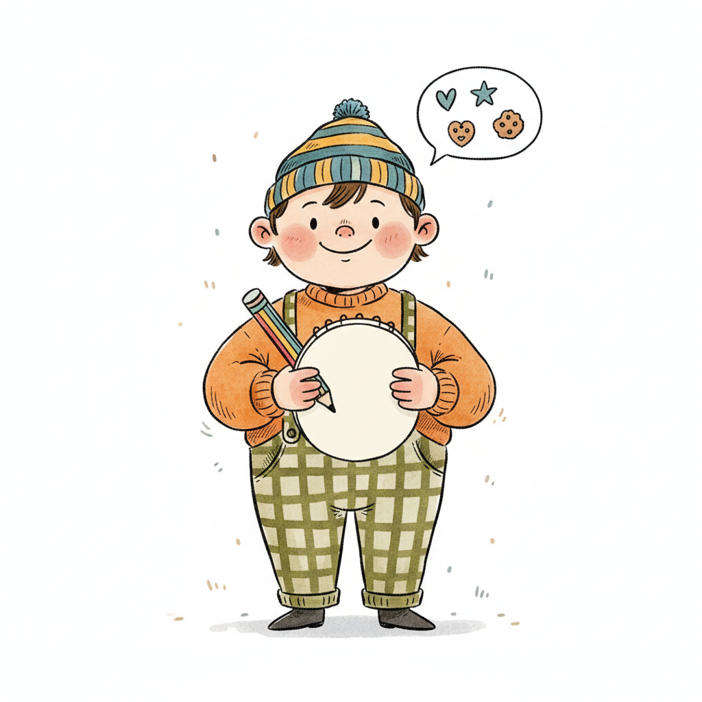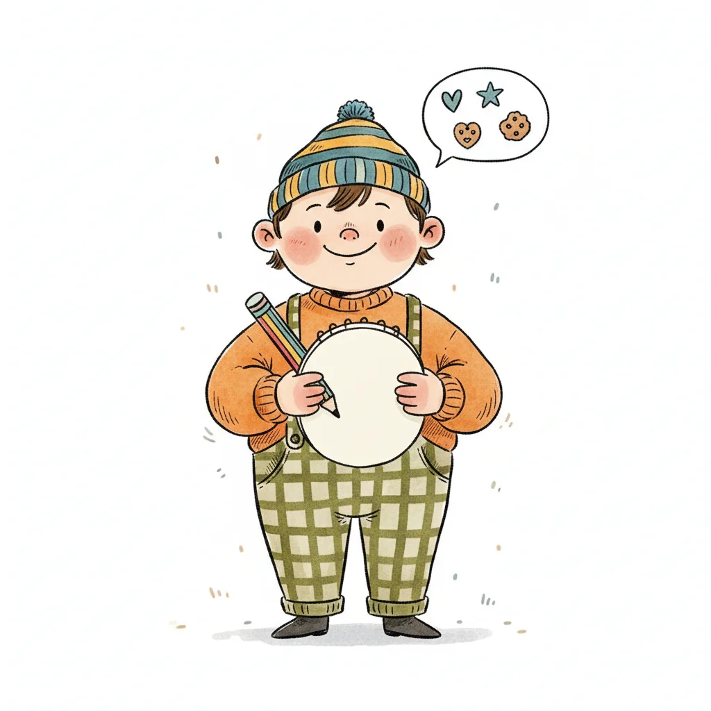 Niedliche, kindgerecht illustrierte Szene mit einem Kind oder einer Person als Hauptfigur, vor rein weißem Hintergrund, im frech-nordischen Aquarell-Skizzenstil. Klare, leicht wackelige Tuschekonturen, sichtbare Pinsel- und Strichtextur, dezente Schraffuren, weiche handgemalte Farbflächen in gedeckten Farben. Einfache, runde Formen. Keine harten Schatten, sondern sanfte, transparente Aquarellschichten. Leicht raue, handgezeichnete Linien statt glatter Vektorkanten. Subtile, vereinzelte Kritzelpunkte oder kleine Details im Hintergrund (wie Pünktchen oder feine Striche), aber keine echte Umgebung oder Landschaft. Die Figur ist mittig zentriert. Insgesamt charmant, humorvoll, warm und handgemacht wirkend. WICHTIG: Das Bild darf ABSOLUT KEINEN TEXT, KEINE BUCHSTABEN und KEINE ZAHLEN enthalten.