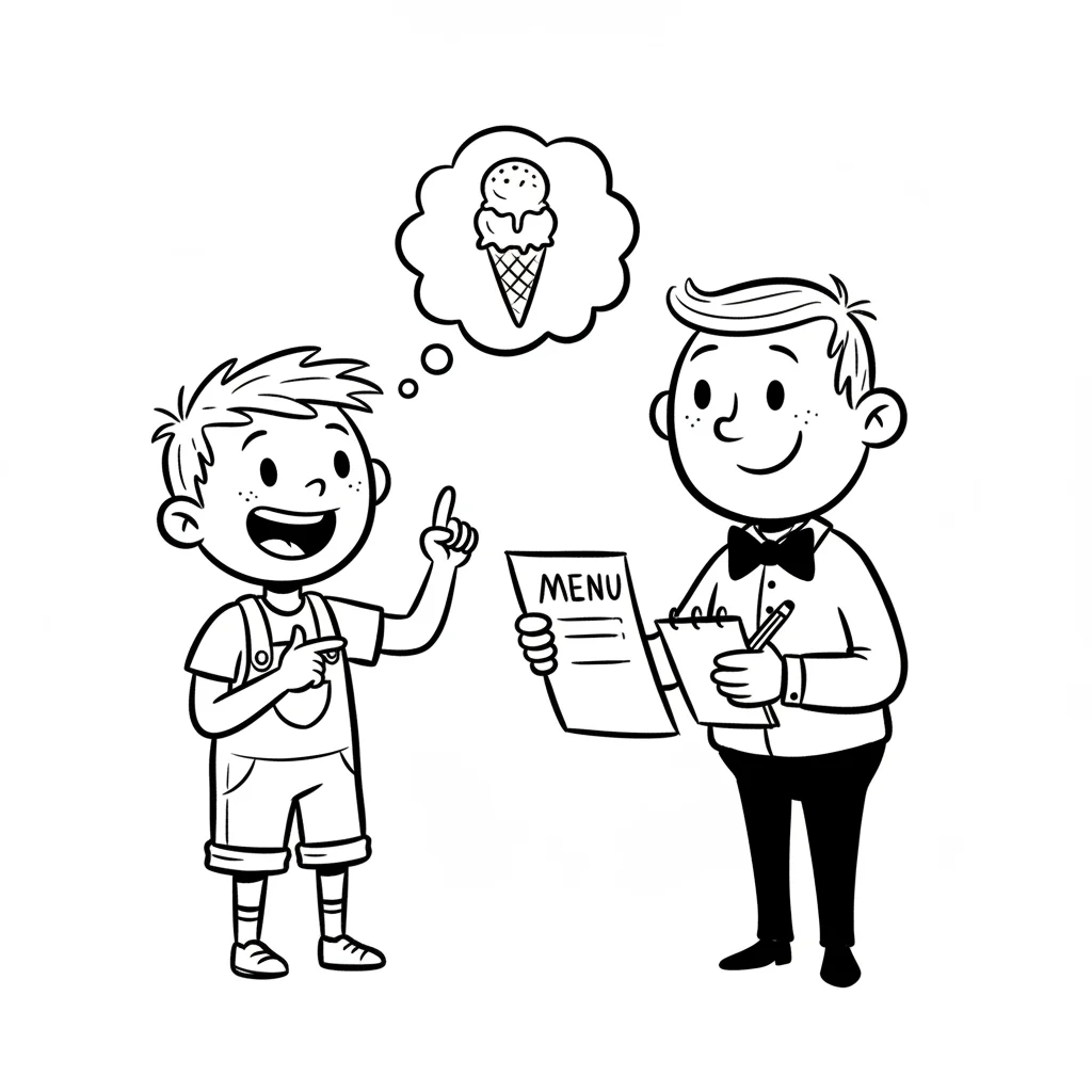 Junge bestellt Eis beim Kellner, der die Bestellung aufnimmt. Im Gedankenfeld des Jungen ist ein Eis.