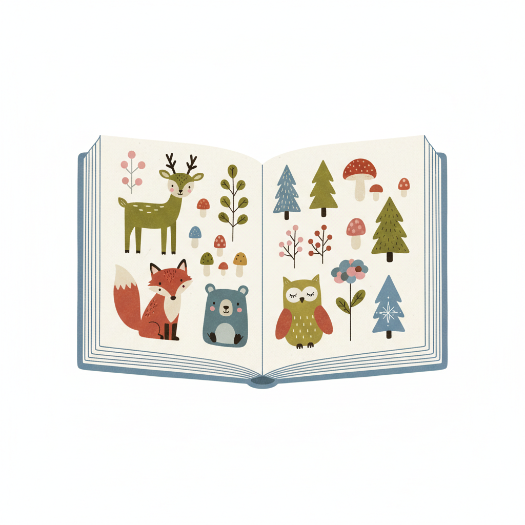 Ein offenes Buch mit niedlichen Waldtieren, Bäumen und Pilzen im Cartoon-Stil auf den Seiten.