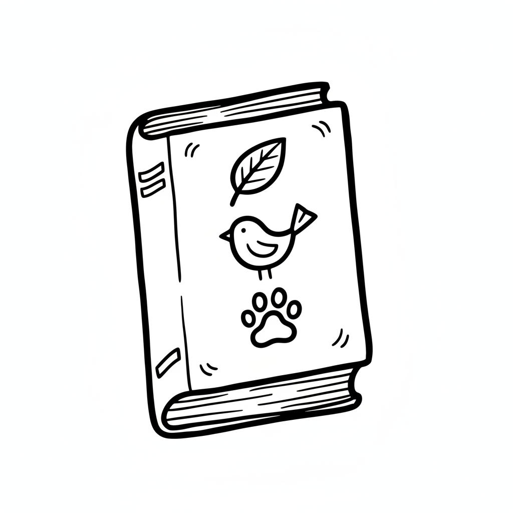 Handgezeichnetes Buch mit Blatt, Vogel und Pfotenabdruck auf dem Cover.